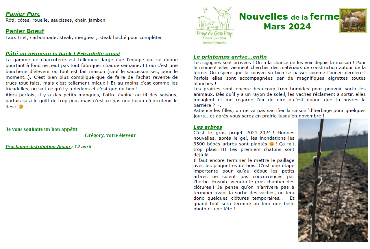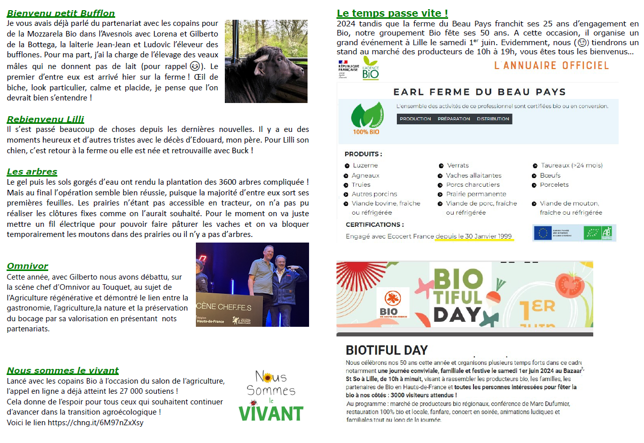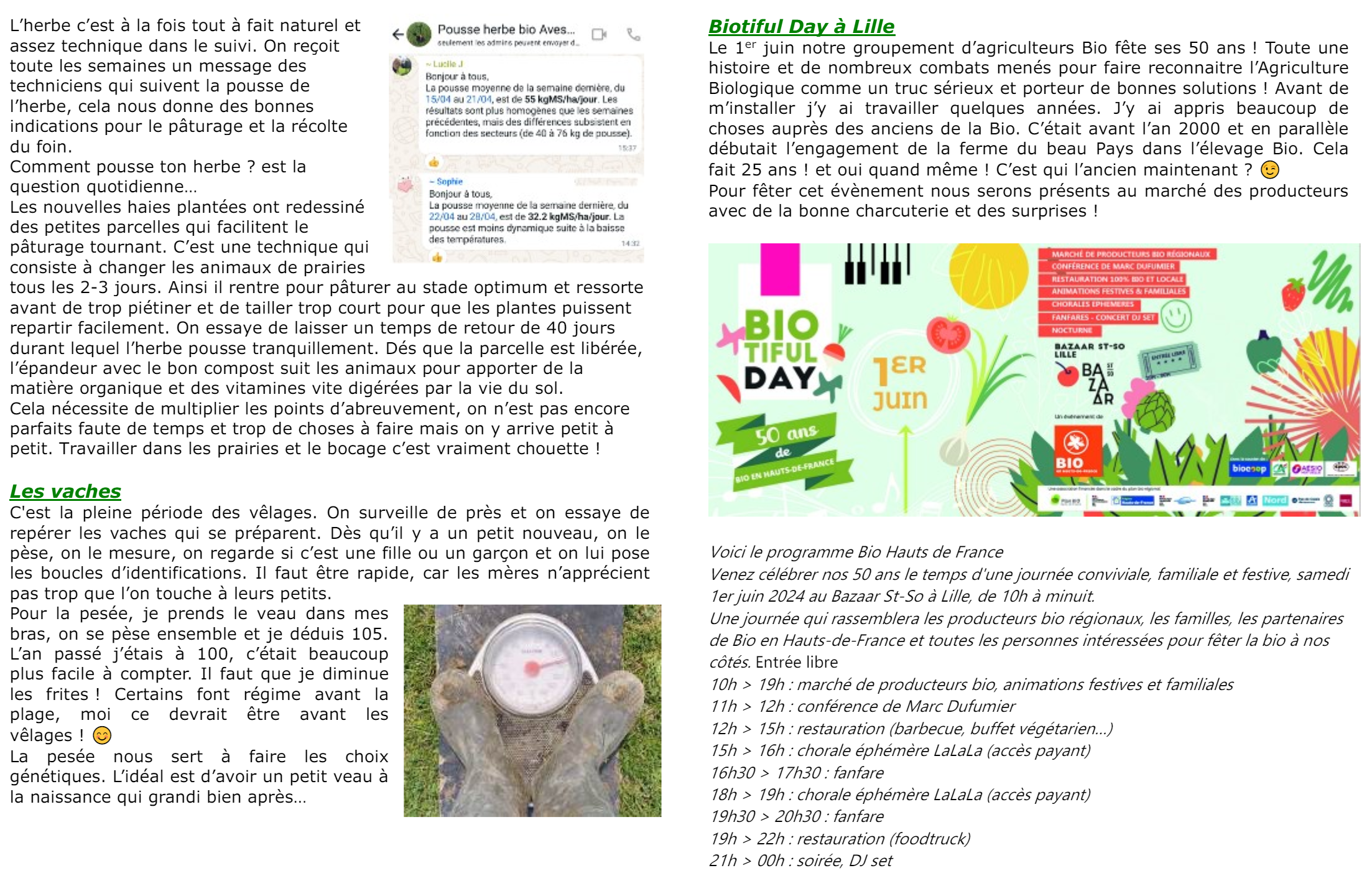 On y parle pousse de l'herbe, pâturage tournant, vêlage mais aussi dates à inscrire dans vos agendas : la Biotyfulday aura lieu le 1er juin prochain à Saint-So et la fête des arbres le 30 juin à Moustiers ! Cliquez sur l'image ci-dessous pour découvrir tout cela !